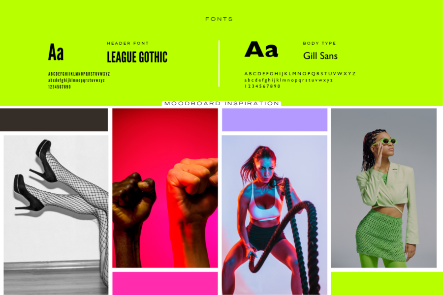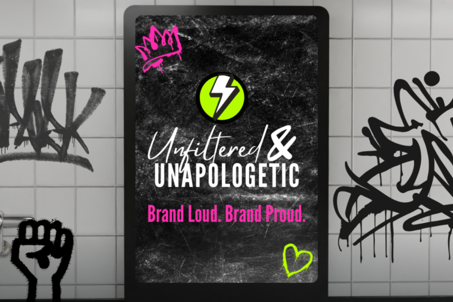 Punchy colors (magenta, cobalt, neon green), gritty texture, bold type, neon meets retro grunge. Brand voice: think “brand therapist meets hype woman.”