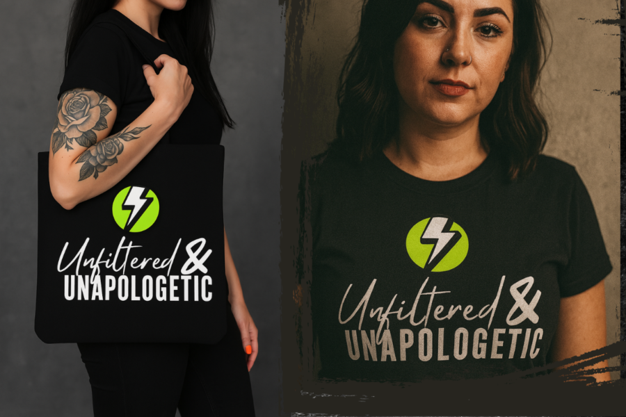 - Merch mockup: shirts, stickers, tote bags with slogans like “Be Too Much.”